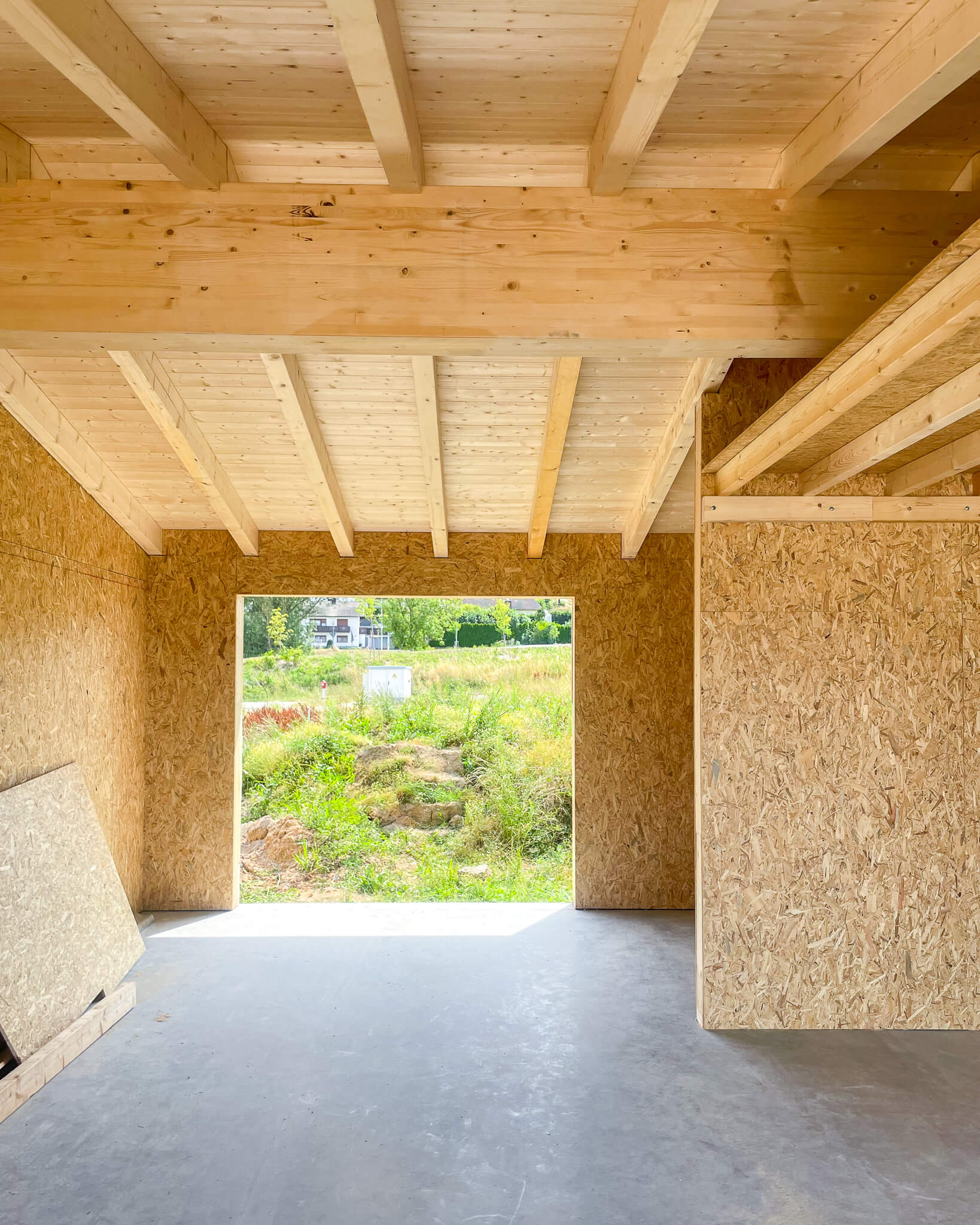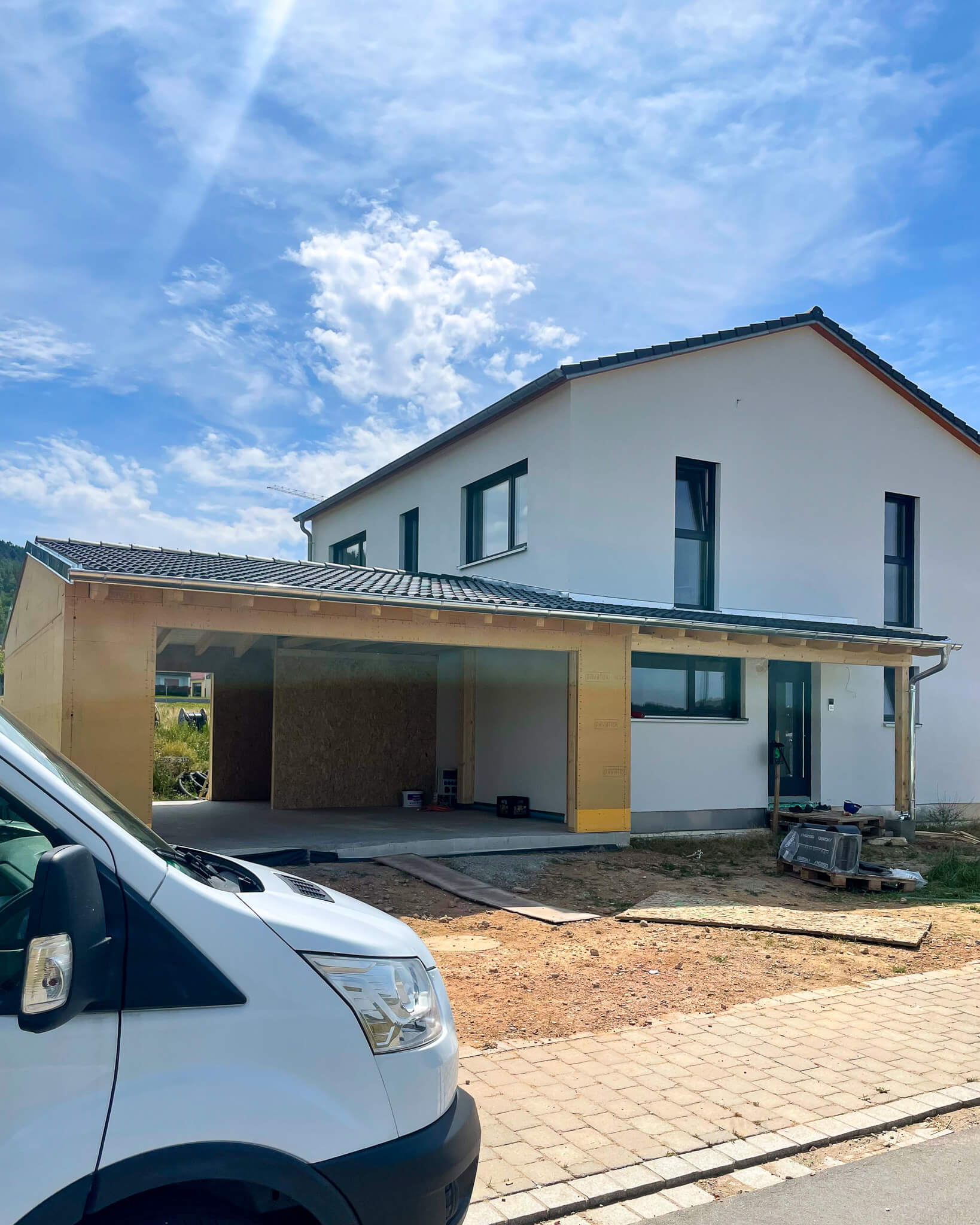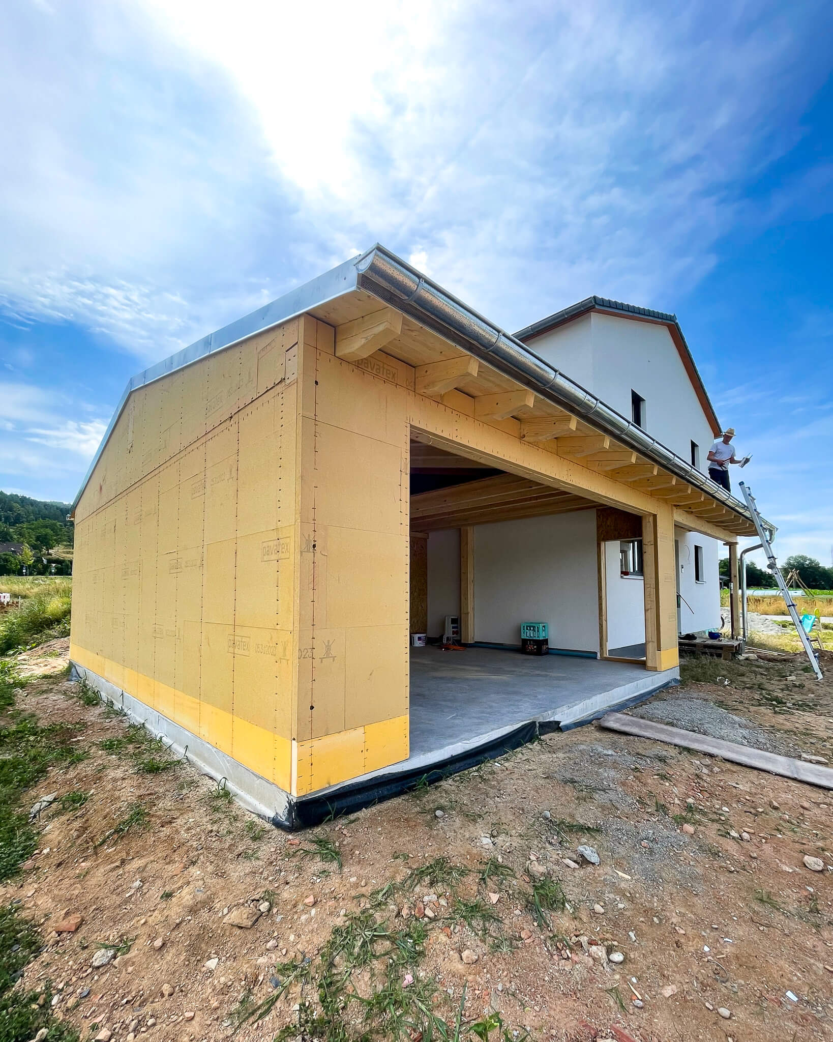 In Holzrahmenbauweise errichteten wir eine Doppelgarage mit Eingangsüberdachung. Die Konstruktion wurde so geplant, dass sie sich harmonisch ins Gesamtbild des Grundstücks einfügt. Nach Fertigstellung der Holzbauarbeiten erhielt die Fassade einen Putz, der Optik und Witterungsschutz vereint.