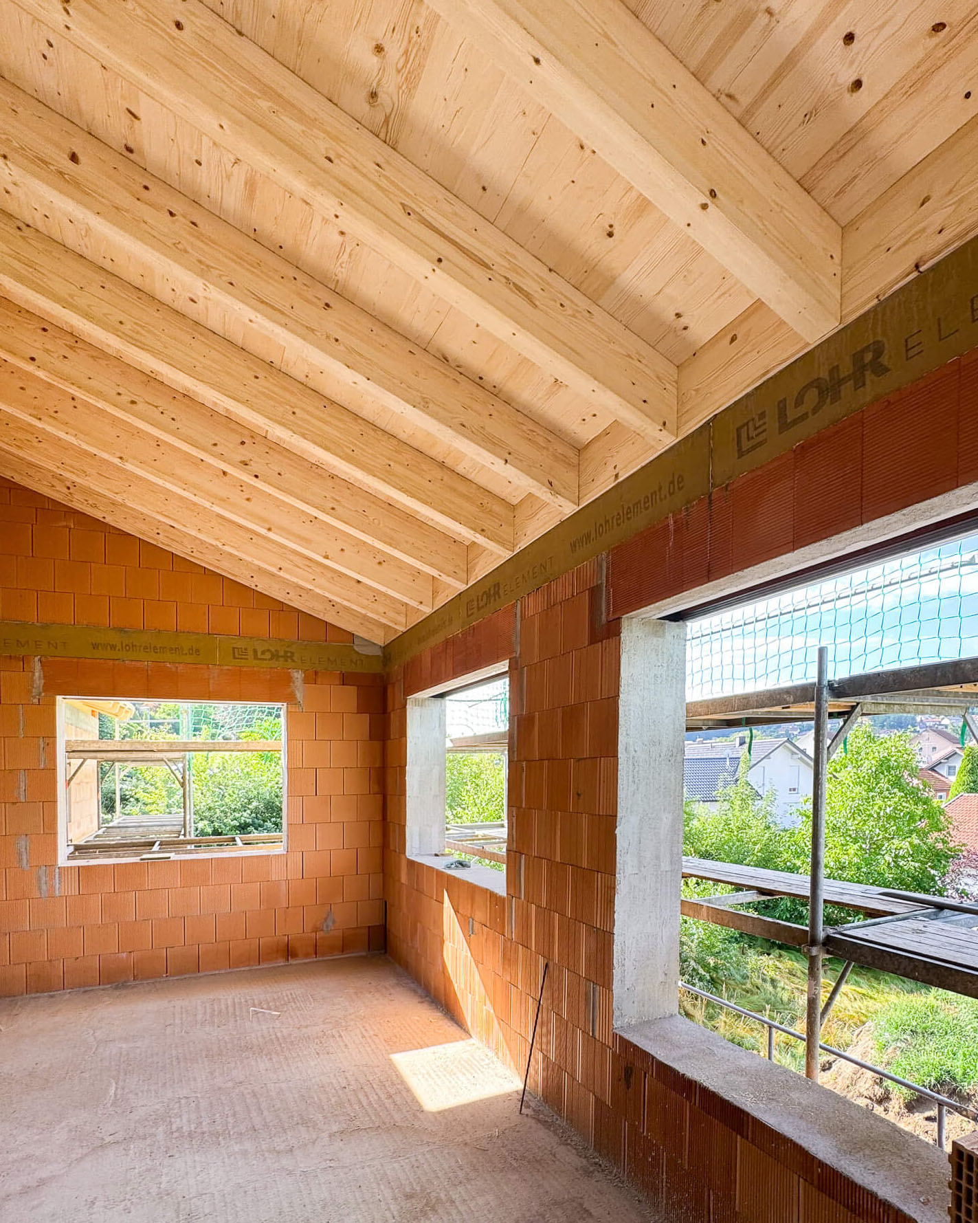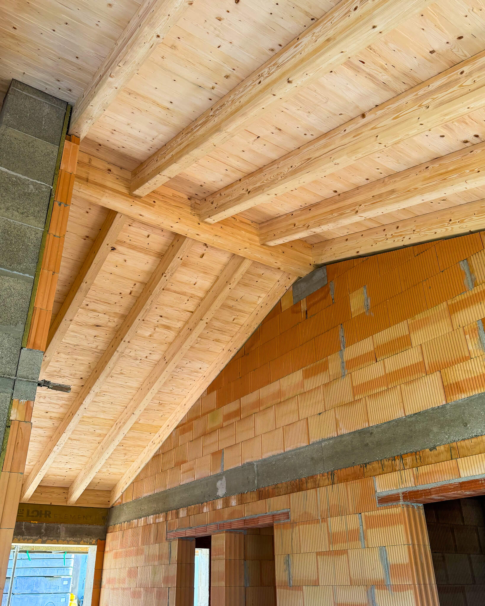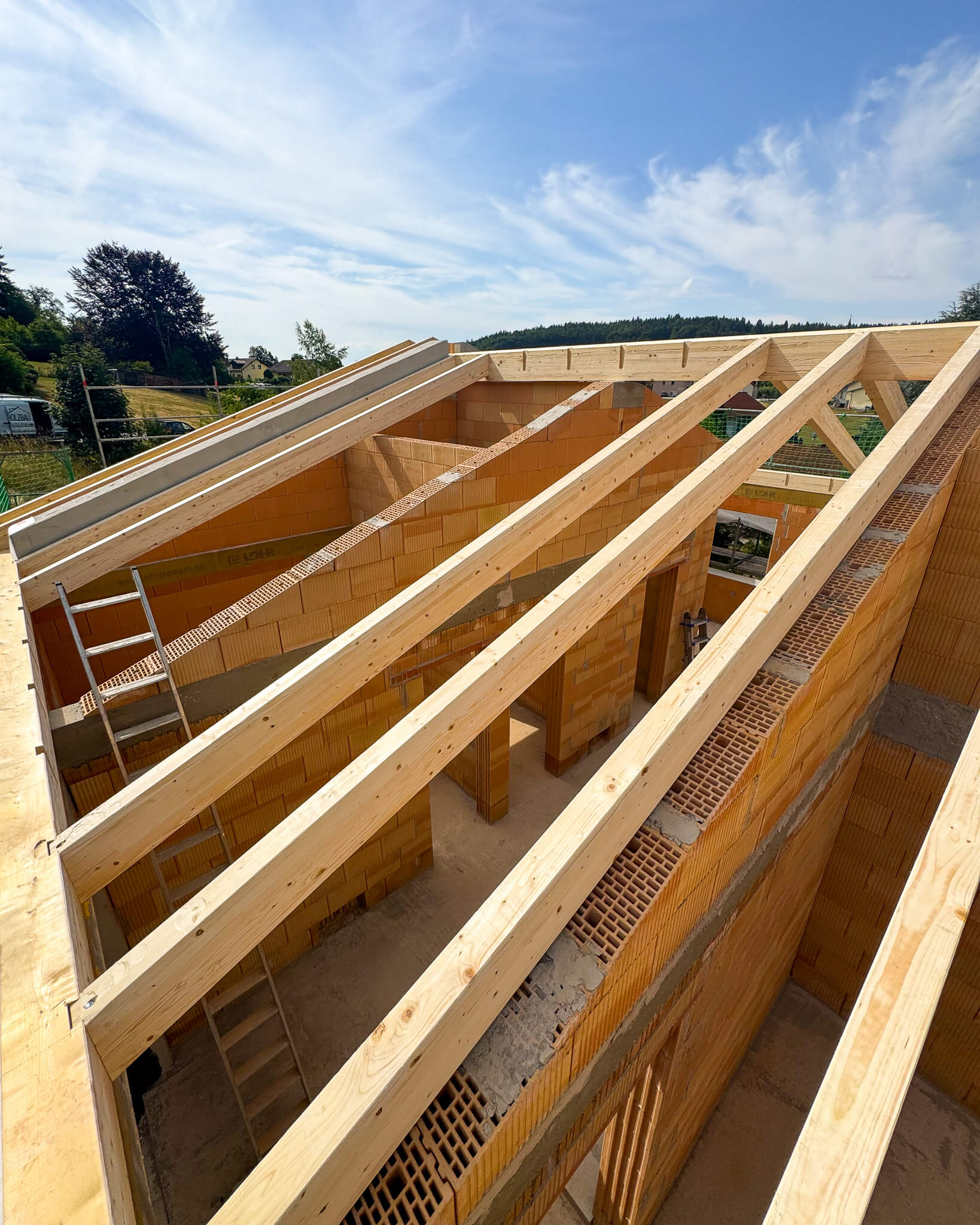 Ein hochwertiger Sichtdachstuhl in traditioneller Holzbauweise mit gehackten Brettern der Firma Dufter prägt dieses Bauprojekt in Niederbayern. Die Balken wurden nachbehandelt und gebürstet, um eine rustikale und langlebige Optik zu erzielen. Zum Leistungsumfang gehörten Lieferung, Abbund, Aufstellen und Schließen des Dachstuhls. Für optimale Energieeffizienz setzten wir auf eine Linzmeier Aufdachdämmung, die sowohl Wärmeschutz als auch ein angenehmes Raumklima gewährleistet.